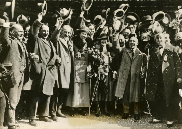 Members of the Rotary Club of London with family, friends, and entertainer Harry Lauder of the Rotary Club of Glasgow, Strathclyde, Scotland (front row, second from right) — gathered in London before traveling to the 1922 Rotary International Convention in Los Angeles, California, USA.