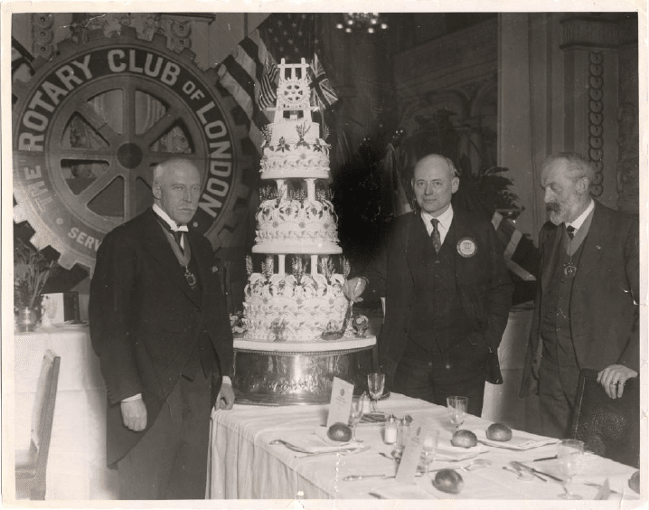 This historical photograph captures a celebration of Rotary’s 20th anniversary in 1925 held by the Rotary Club of London, England. The image features three prominent figures in Rotary’s early history standing beside an elaborate, multi-tiered anniversary cake: L.G. Sloan, Ted Unwin and Ches Perry (centre), who served as the first General Secretary of Rotary International.