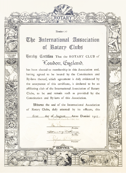 After the London members organized the club, it took a year to receive its charter. Correspondence between General Secretary Chesley R. Perry and charter member Arthur P. Bigelow reveals some of the club members’ questions about joining and paying dues to what was then the National Association of Rotary Clubs, made up of only U.S. clubs.
